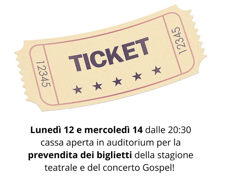 Lunedì 12 e mercoledì 14 dalle ore 20.30 ci sarà la cassa aperta in Auditorium per la prevendita dei biglietti della stagione teatrale e del concerto Gospel