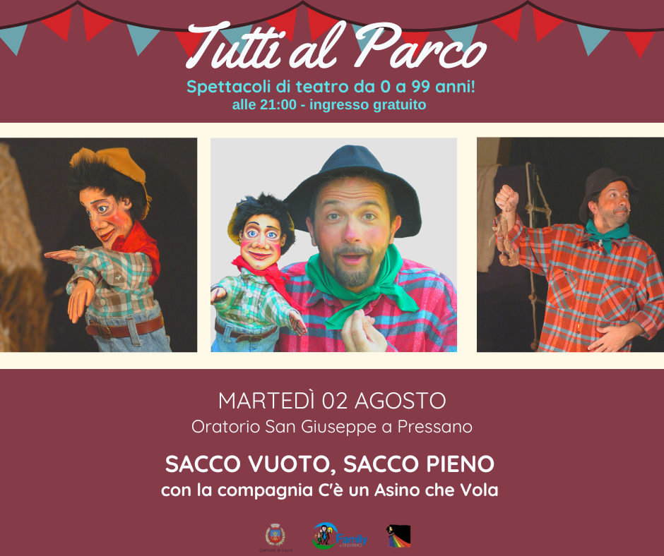 SACCO VUOTO, SACCO PIENO con la compagnia teatrale C’è un asino che vola martedì 2 agosto -Oratorio San Giuseppe a Pressano