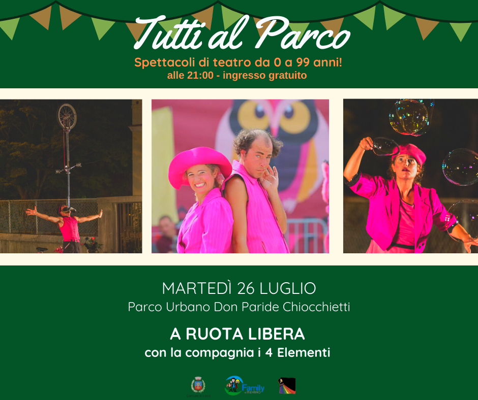 A RUOTA LIBERA con la compagnia teatrale I 4 elementi martedì 26 luglio- Anfiteatro parco urbano Don Paride Chiocchetti
